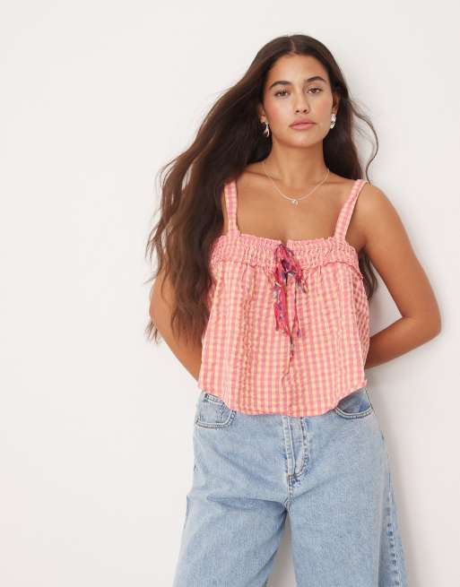 Free People cami smock top in pink check with bow detail