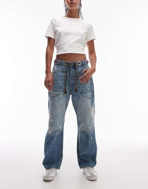 Free People slouchy barrel ripped jeans with paint splatters in mid blue