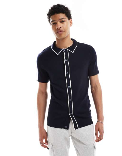 French Connection tipped knitted button through polo in navy and ecru