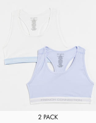 French Connection 2 pack crop tops with logo tape in white and saltwater blue
