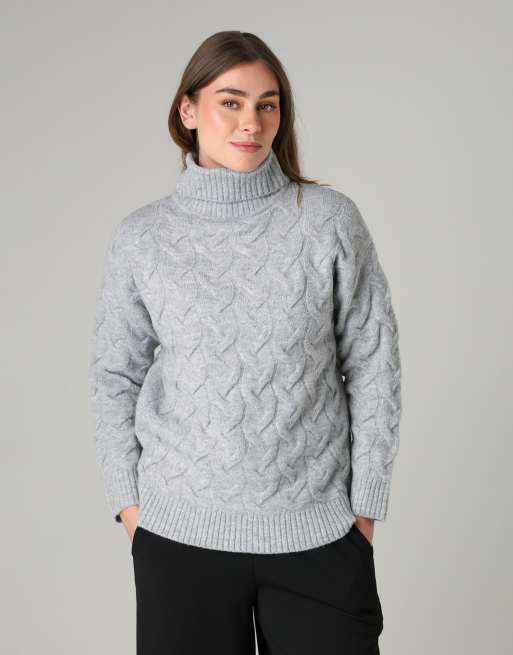 French Connection Cable knit roll neck long sleeve jumper in light grey