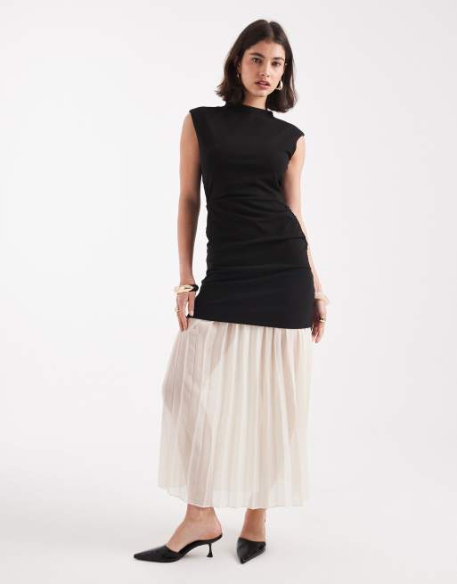 French Connection contrast midi dress with pleated skirt in black and cream