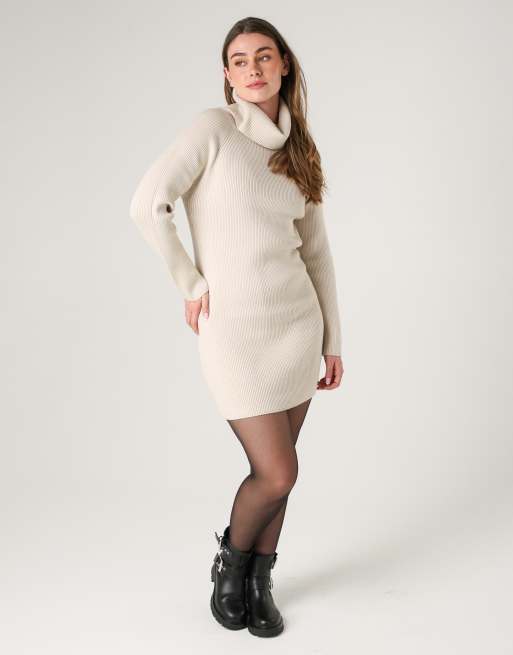 French Connection Cosy ribbed cowl neck long sleeve mini dress in cream