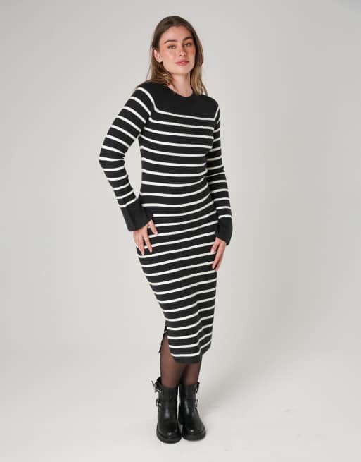 French Connection Cosy striped midi dress with bell sleeves in dark grey