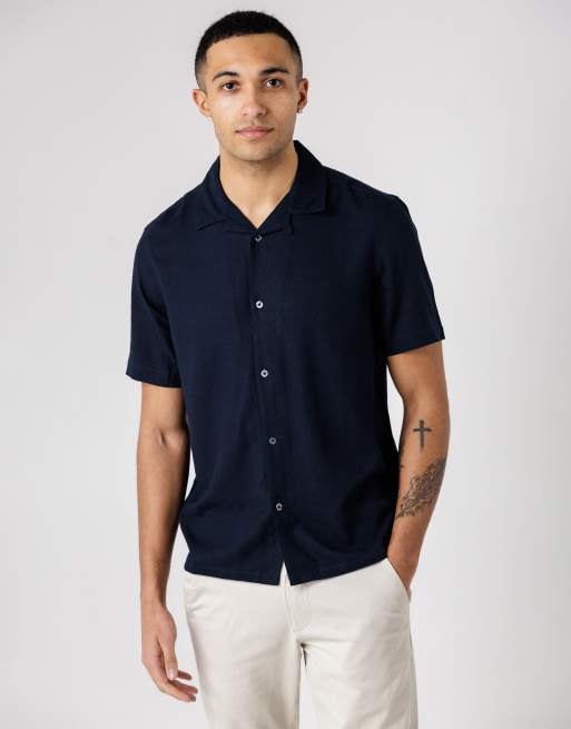 French Connection Linen blend short sleeve revere collar shirt in navy