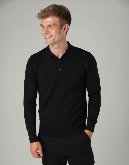 French Connection Long sleeve button polo top in black