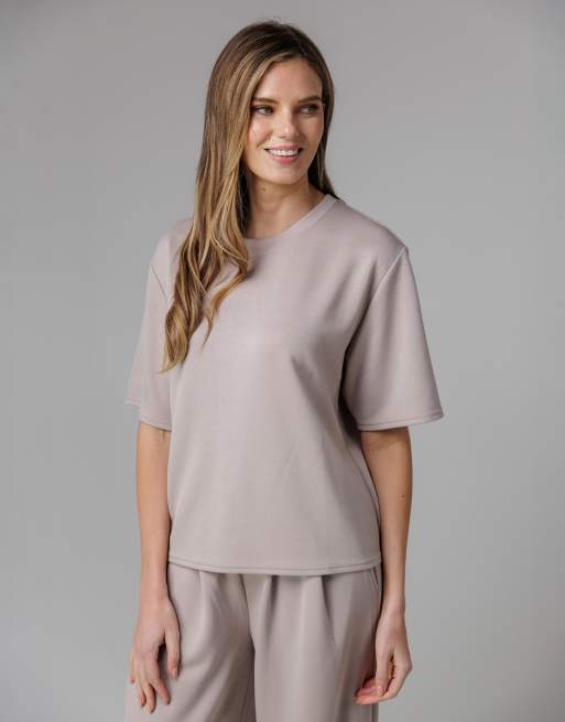 French Connection Luxe short sleeve crew neck pinched top in beige