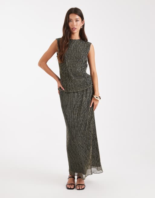 French Connection metallic plisse midaxi skirt co-ord in gold