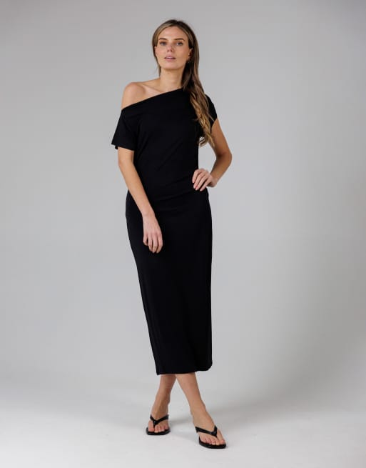 French Connection Ruched boat neck short sleeve midi dress in black