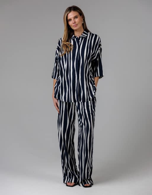 French Connection Vertical stripe oversized button-up 3/4 length sleeve shirt in navy