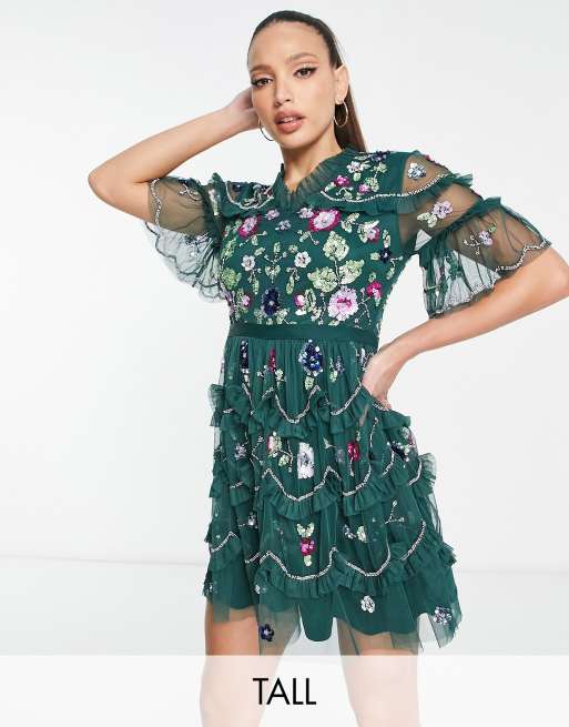 Frock and Frill Tall tiered mini dress with multi embellishment in dark green