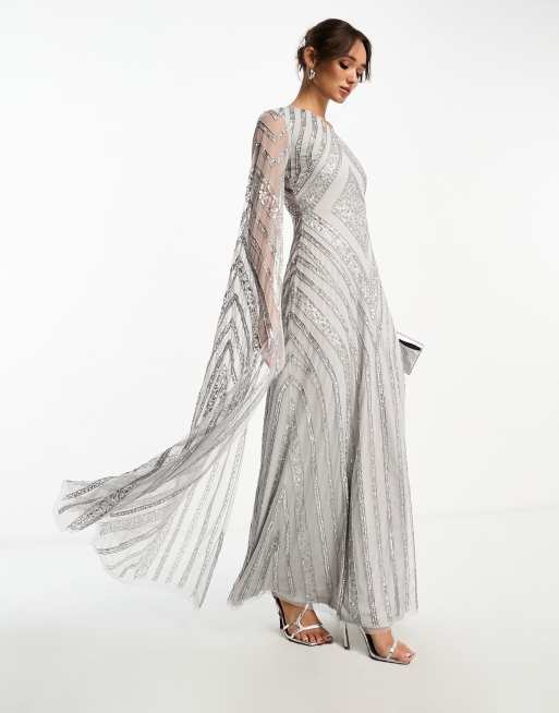 Frock and Frill allover embellished maxi dress with one shoulder cape detail in silver grey