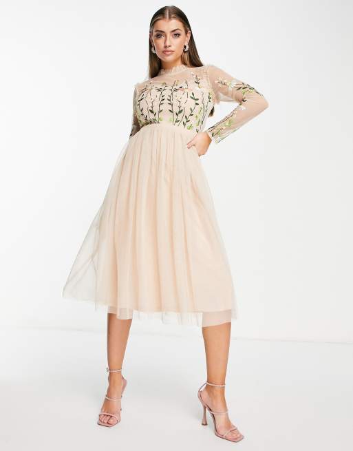 Frock and Frill Bridesmaid midi dress with pleated skirt and embellished top in dusty mauve