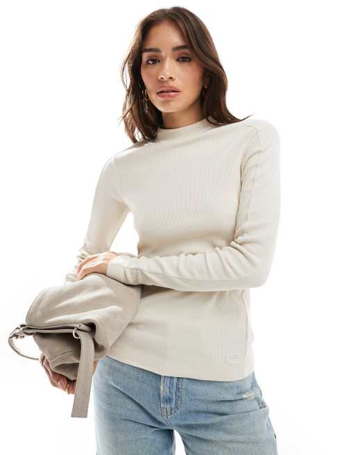 G-Star slim ribbed long sleeve t-shirt in beige with mock neck