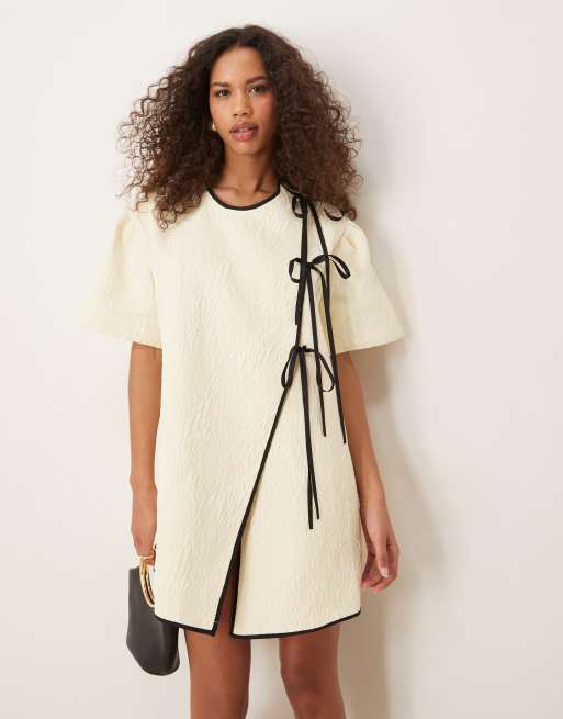 Ghospell asymmetric contrast bow mini dress in pearl ivory