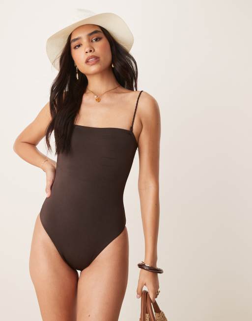 Gina Tricot high leg swimsuit with twisted double straps detail in brown