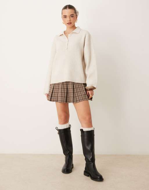 Gina Tricot knitted button polo collar long sleeve top in stone