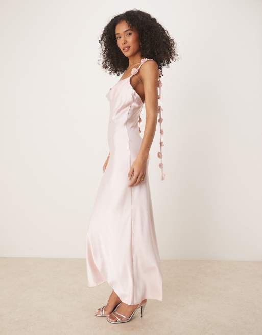 Gina Tricot midi satin cowl neck dress with 3D floral applique in light pink