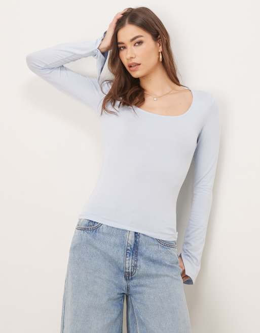 Gina Tricot Soft Touch long sleeve top with scoop neck and split cuffs in blue