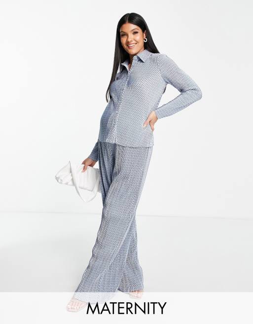 Glamorous Maternity wide leg plisse trousers in blue spot co-ord