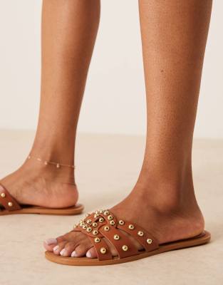 Glamorous Wide Fit studded flat sandals in tan