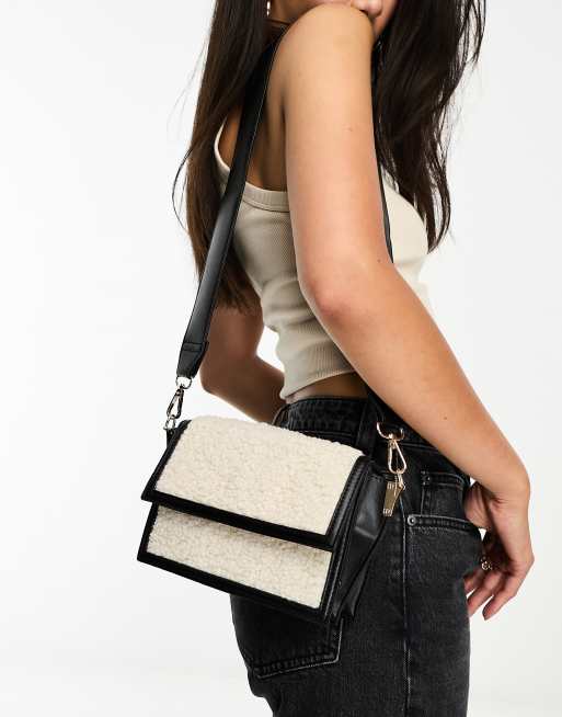 Glamorous borg panelled crossbody bag with webbing strap in black and cream