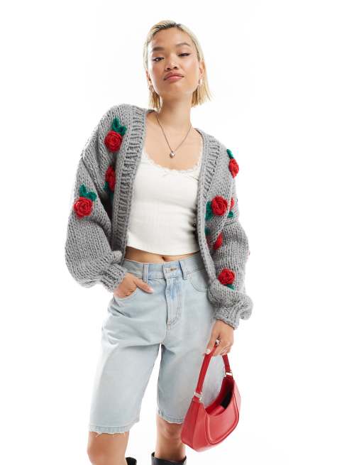 Glamorous boxy knitted luxy chunky cardigan with applique rose detail in grey marl