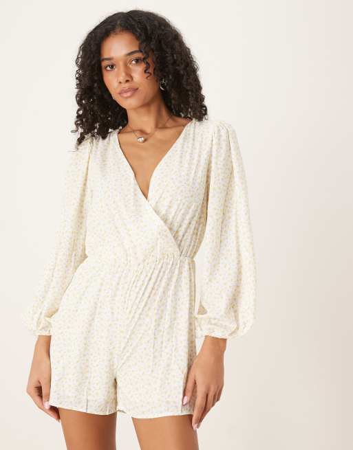 Glamorous Cinched waist long sleeve playsuit in white yellow mini ditsy