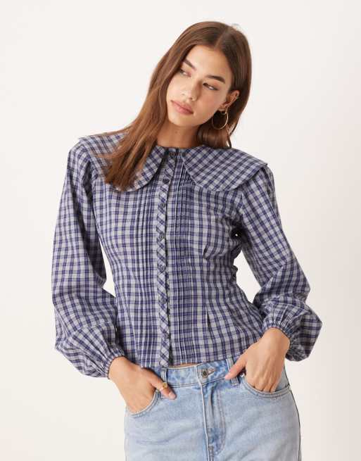 Glamorous dramatic collar sinched blouse in navy check