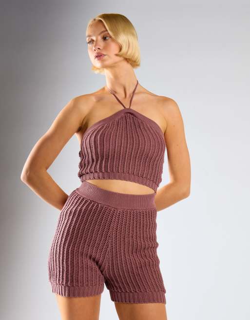 Glamorous Halter-neck-ribbed crop-top in mink