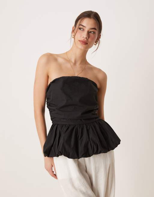 Glamorous ruched puffball peplum top in black