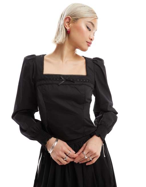 Glamorous square neck bow detail fitted blouse in black poplin co-ord