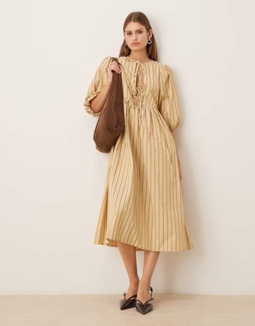 Glamorous Tie-front midi-dress in beige brown stripe