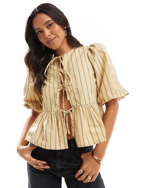 Glamorous tie-front top in beige brown stripe