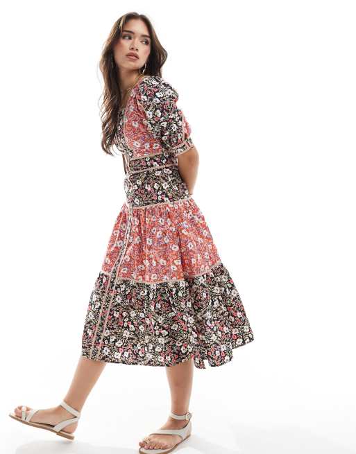 Glamorous tiered button front midi dress in mixed folk poplin