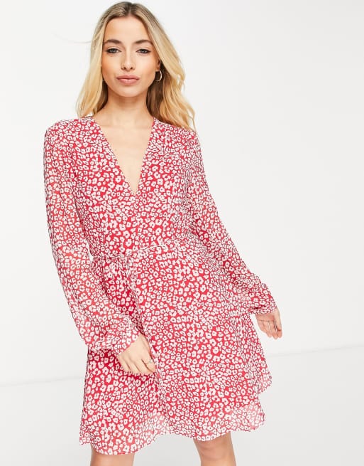Glamorous v-neck dress with tie waist in red pink leopard