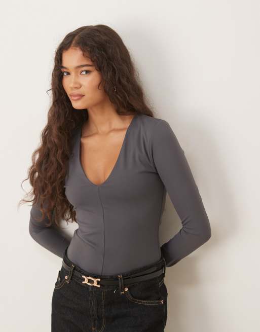 Glamorous V-Neck Long Sleeve Bodysuit in dark grey