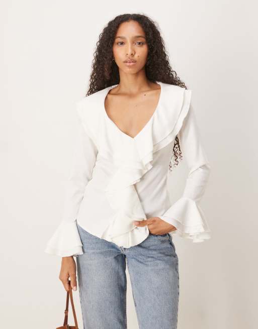 Glamorous V-Neck Ruffle Trim Blouse in off white