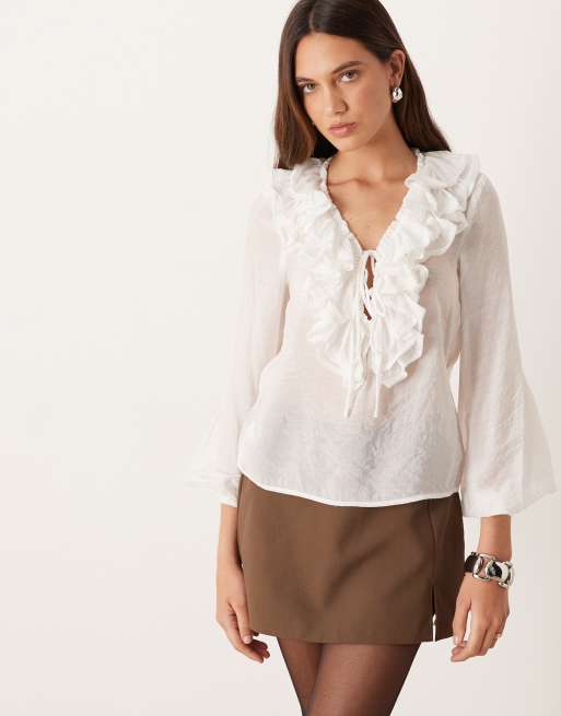 Glamorous V-Neck Tie Front Ruffle Trim Blouse in cream