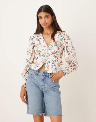 Glamorous V-Neck Top With Puff Long Sleeves in stone multi floral