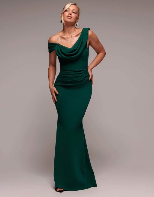 Goddiva Asymmetric chiffon cowl neck maxi dress in bottlegreen