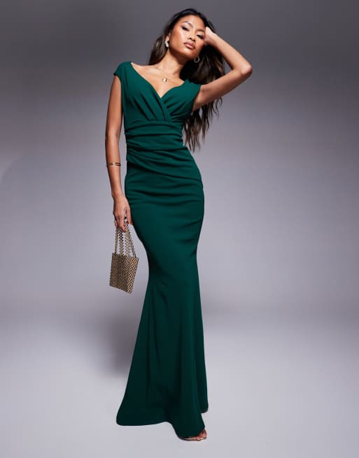 Goddiva Bardot pleated maxi dress in emerald