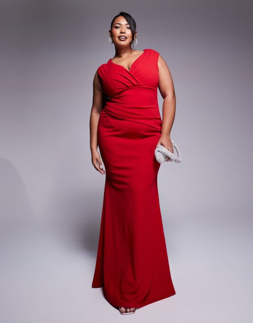 Goddiva Curve bardot pleated maxi dress in red