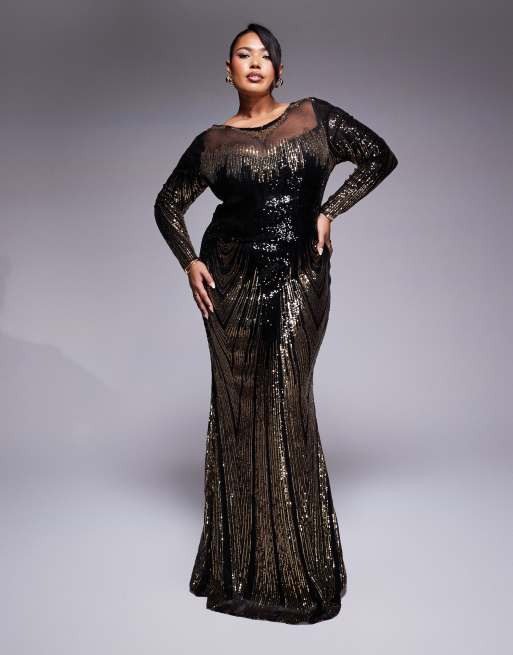 Goddiva Curve long sleeve aztec sequin maxi dress in gold