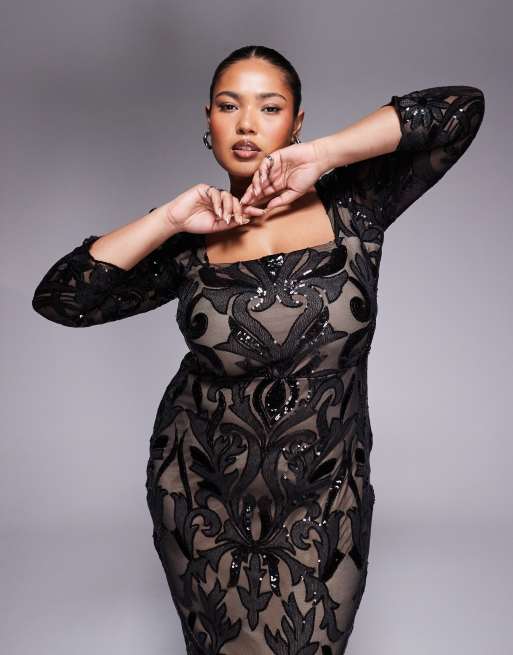 Goddiva Curve Square neck scalloped lace midi dress in black