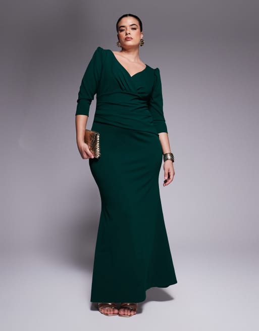 Goddiva Curve Three quarter faux wrap neck maxi dress in emerald green