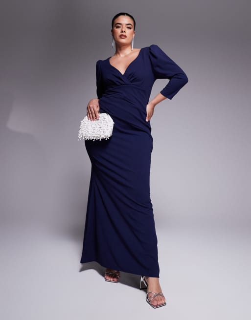 Goddiva Curve Three quarter faux wrap neck maxi dress in navy blue