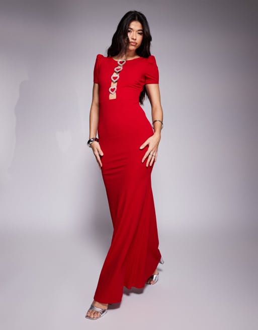 Goddiva Diamante embellished heart brooch maxi dress in red in scuba style fabric