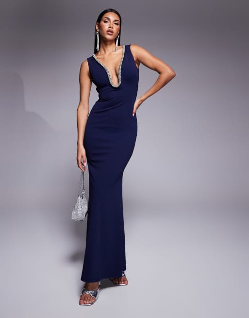 Goddiva Diamante embellished super plunge maxi dress in navy in scuba style fabric