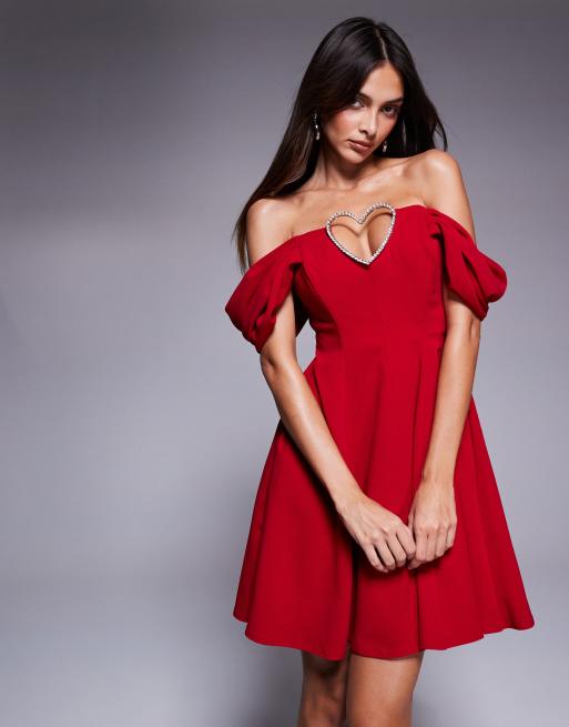 Goddiva Diamante heart trim a line mini dress in red